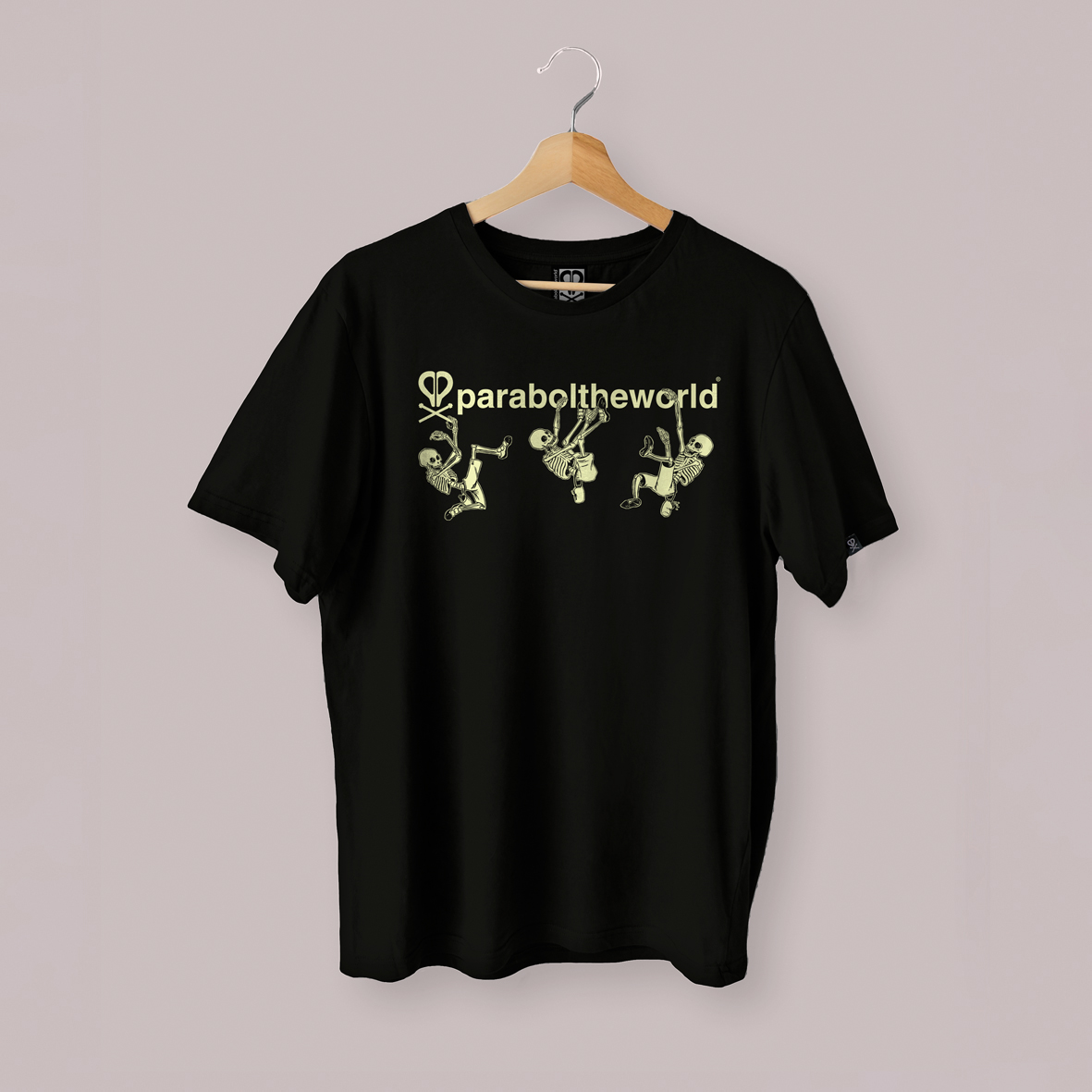 Camiseta color  NEGRO de manga corta de alto gramaje 190g/m2 . 100% de algodón, altamente transpirable. Corte tubular, sin costuras laterales. Dispone de tapacosturas en cuello, haciéndola así más cómoda. Estampado en serigrafía Etiqueta con el logotipo de Paraboltheworld en la manga.